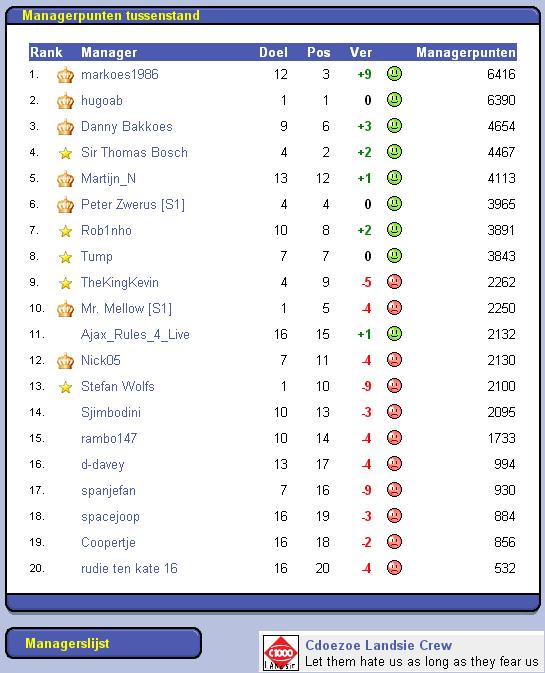 Hier een overzicht van alle rangen en standen van de competitie.